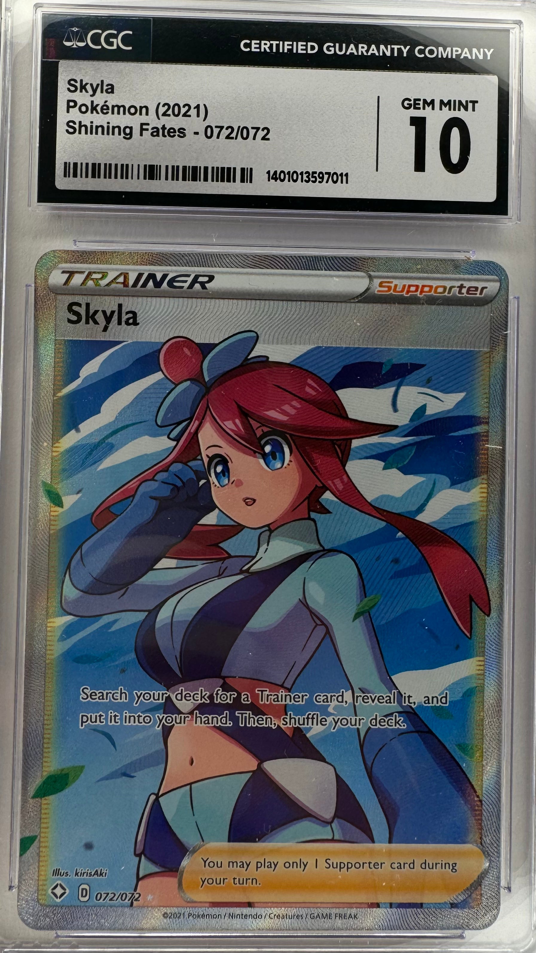 The Skyla (72/165) card from the Pokémon TCG: Shining Fates series is an Ultra Rare card. Skyla is a Supporter card with the following effect: Search your deck for a Trainer card, reveal it, and put it into your hand. Then, shuffle your deck. Skyla is the Flying-type Gym Leader of Mistralton City from Pokémon Black & White, and she's known for being a talented airplane pilot